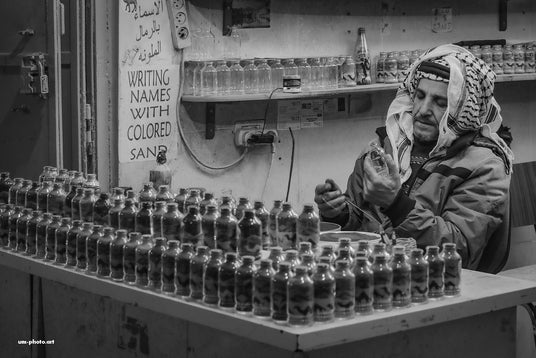 🎨 Das Design stammt von einem palästinensischen Künstler, der jede Flasche mit charaktervollen Motiven berühmter Städte bemalt: