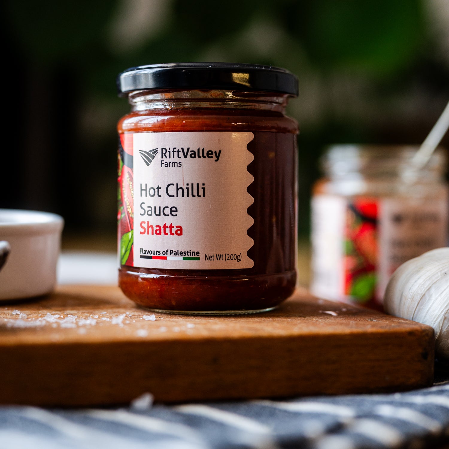 Shatta ist eine traditionelle Chilisauce aus Palästina – hergestellt aus frischen roten Chilischoten, Olivenöl, Salz und Gewürzen. Sie gehört zur alltäglichen Küche vieler palästinensischer Familien und bringt würzige Schärfe mit authentischem Charakter.